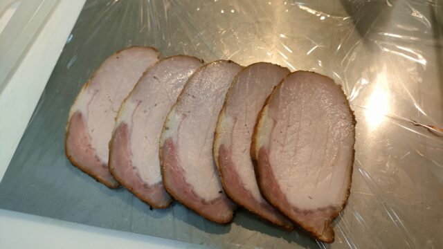 30分ほど風に当て、煙臭さが落ち着いてからラップに包んで冷蔵庫で冷やし、肉が閉まってから包丁で薄切りにする。