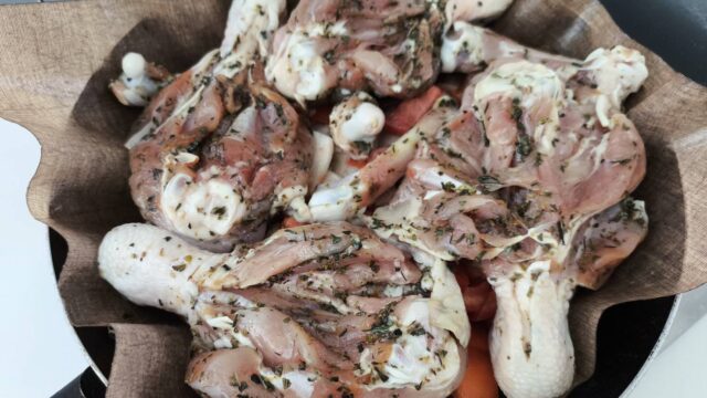 重量の1%で砂糖と塩で味付けし、ミックスハーブを適当にまぶし1日ほど冷蔵庫で寝かせてから調理開始。