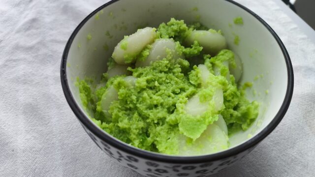 枝豆は薄皮を取って、すり鉢かフードプロセッサーですりつぶし、砂糖と塩を混ぜれば完成。