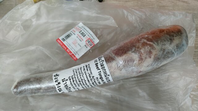 俺氏が普段購入しているトリミング牛肉(牛スジ)1kg190バーツと今回の皮むき牛タン1kg285バーツを比較すると、牛タンは煮込み料理としてのポテンシャル高いけれど単価1.5倍までの価値は無いかなぁ。