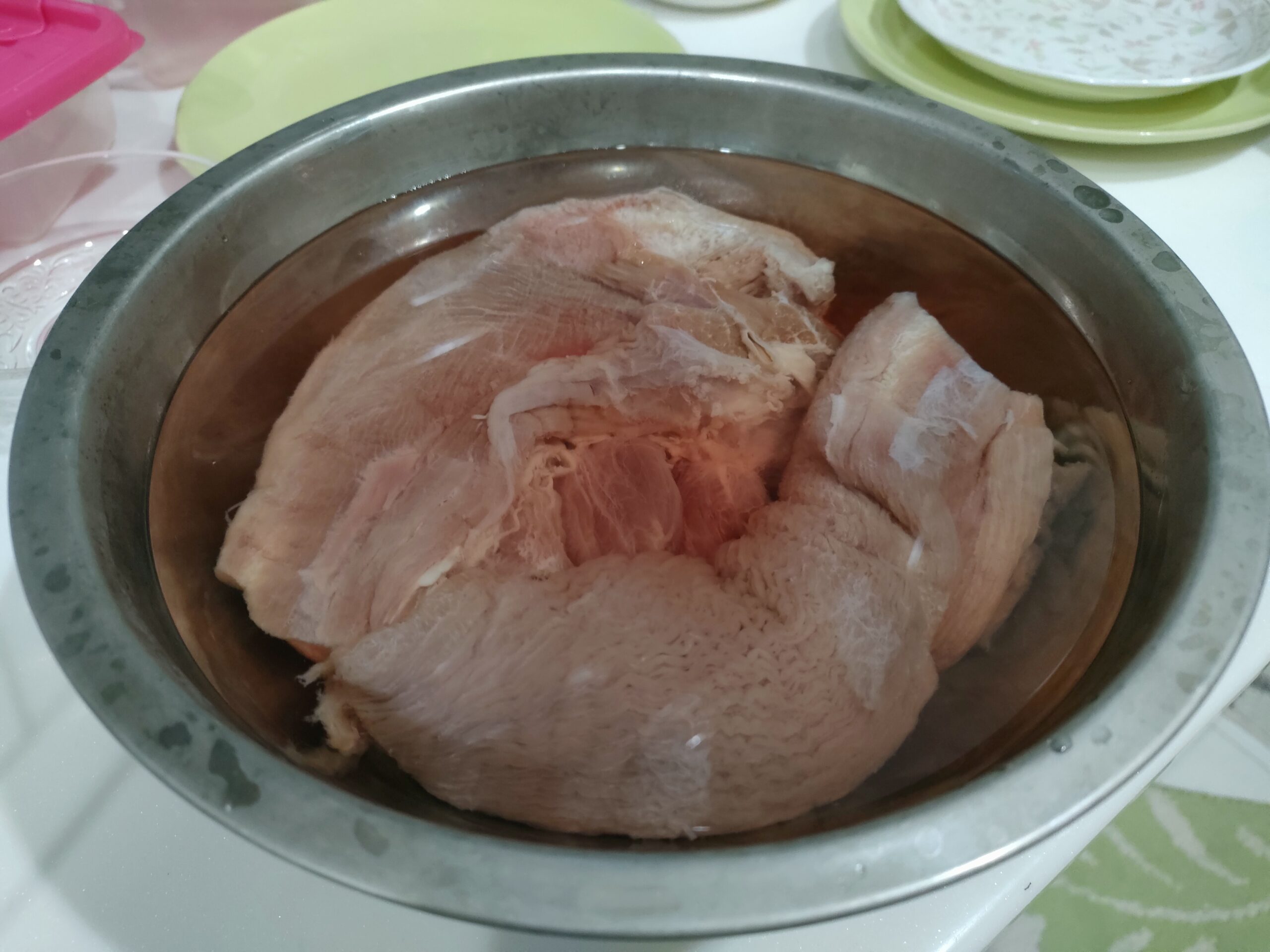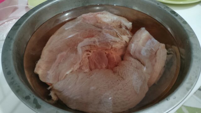 その後重曹を溶かした水に肉を沈め、冷蔵庫で一晩寝かせ再度流水で揉み洗いし、下処理を終える。