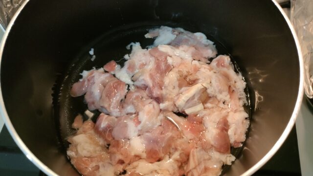 鍋にお肉を入れ約5分ほど茹で灰汁を出します。5分茹でた肉を良く洗いアク抜き終わり。