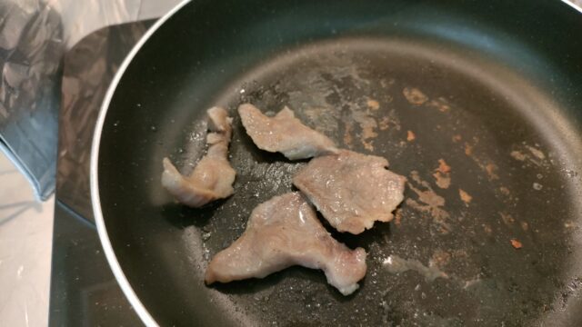 冷凍待ちの間が暇なので、トリミングしたスジ肉部分を試食してみる。