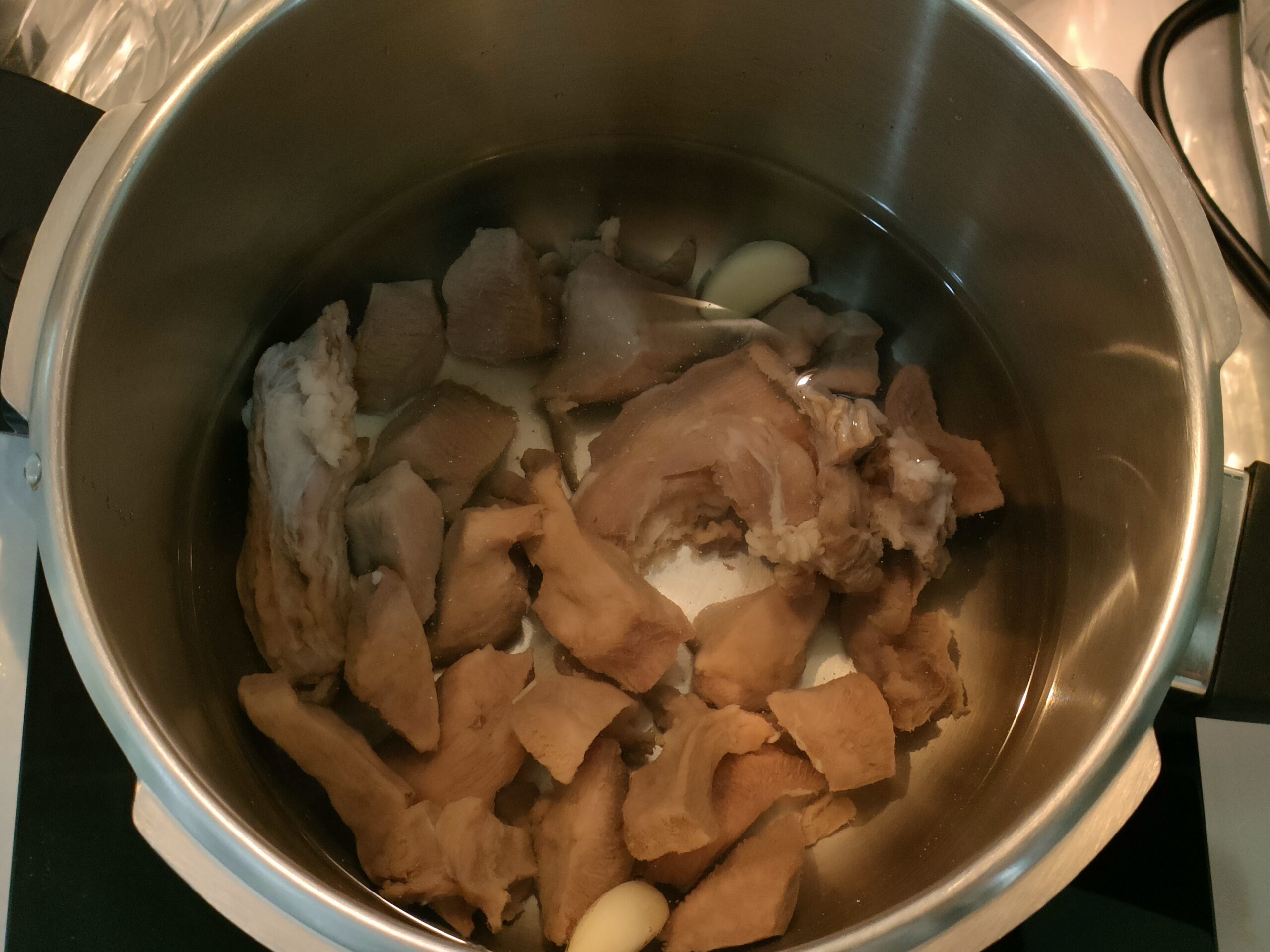 洗った肉を圧力鍋に入れ肉が浸る水を入れて20分ほど加圧状態で加熱し、圧力が抜けるまで放置すれば臭みの抜けた柔らかい牛タンの下処理完了。