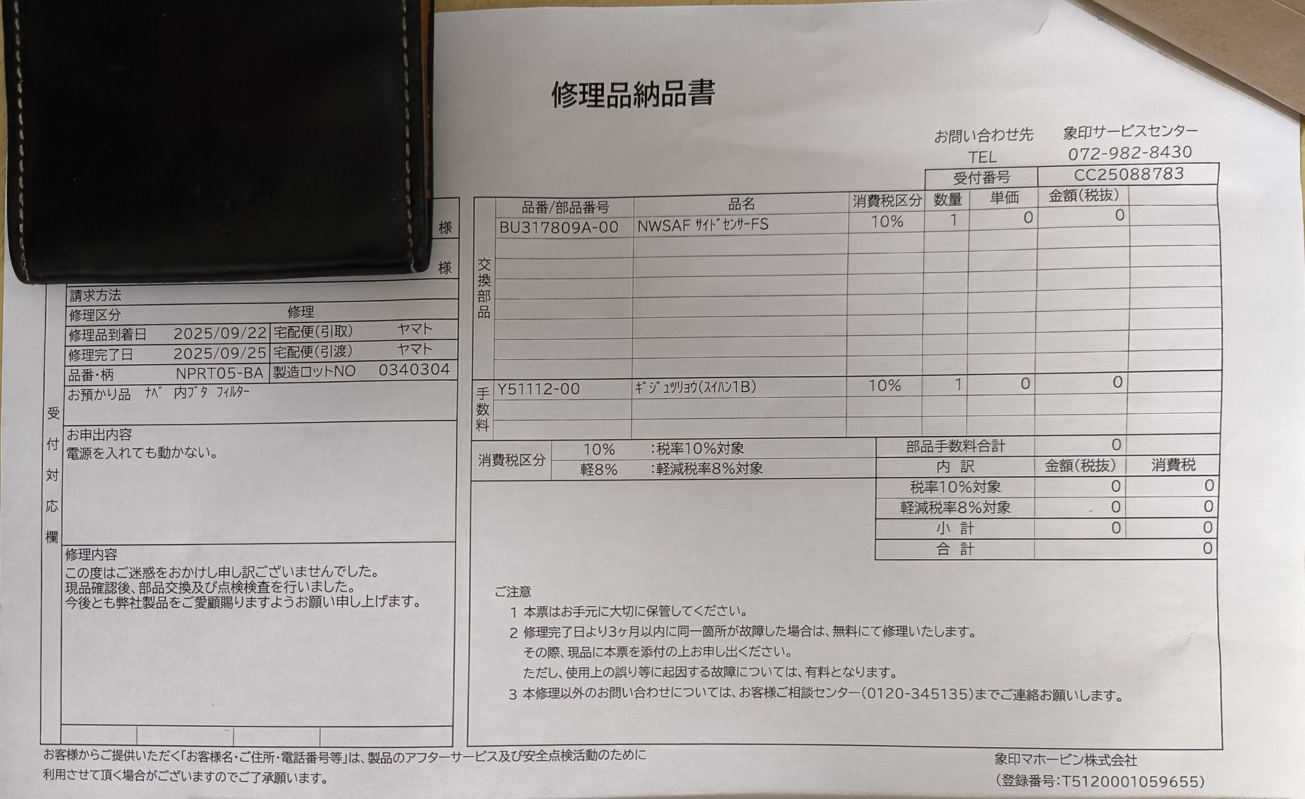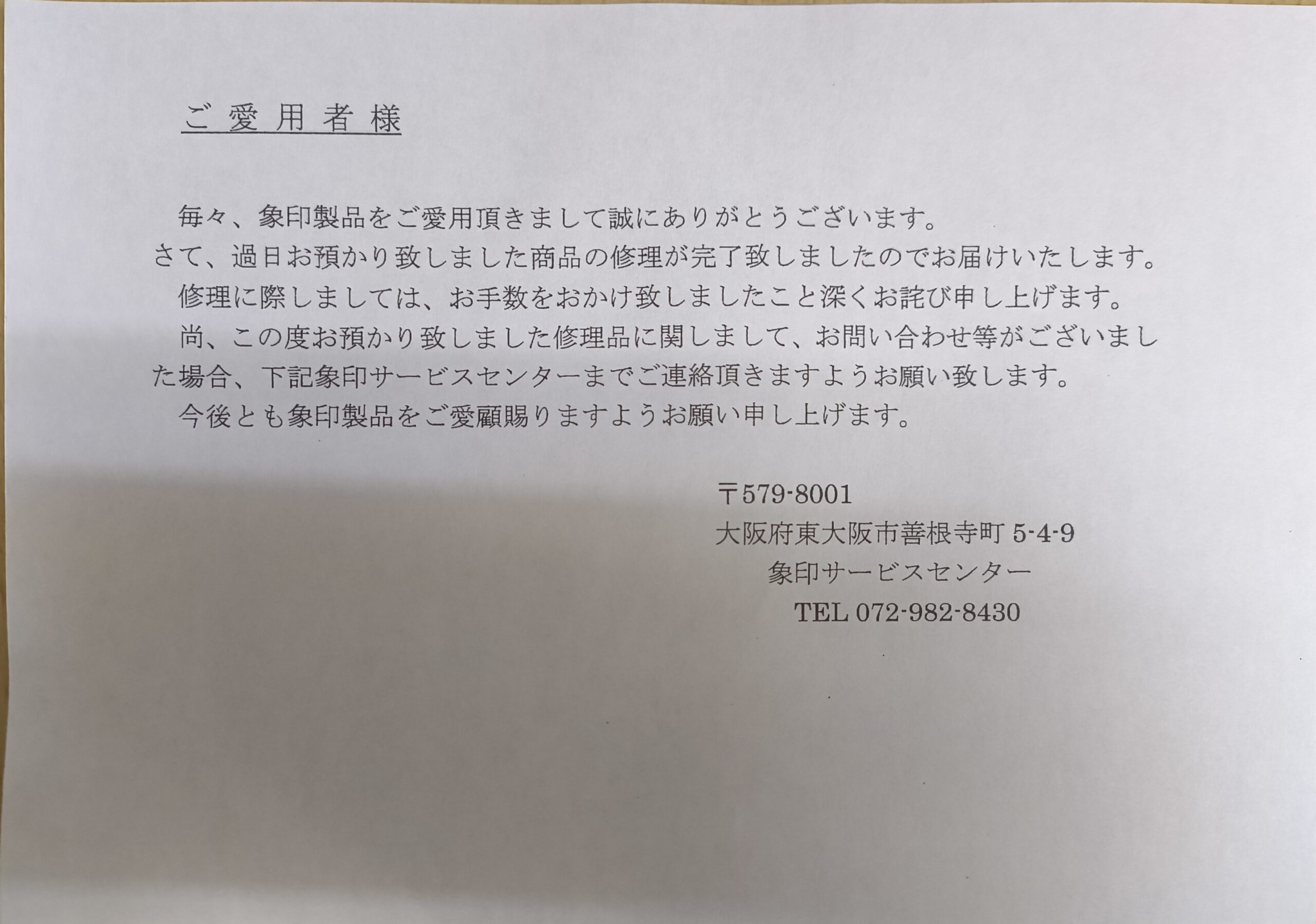 あとは修理後のお手紙が入ってました。修理した炊飯器のお問い合わせはフリーダイアルの電話番号ではなく大阪の象印サービスセンターに連絡してくださいって書いてるね。