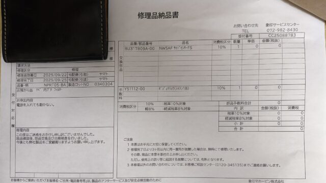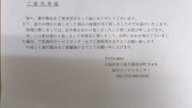 あとは修理後のお手紙が入ってました。修理した炊飯器のお問い合わせはフリーダイアルの電話番号ではなく大阪の象印サービスセンターに連絡してくださいって書いてるね。