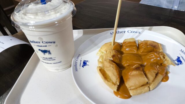 嫁氏が飲みたいミルクシェイクとタイティー味のパン120バーツ(約540円)です。