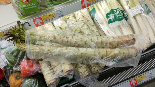 makroで野菜を物色。嫁氏が食べたい豚あばら肉と大根のナンプラースープの材料である大根と俺氏が欲しいネギ。キノコ類を購入。棚に見た事の無い巨大な茎?が置いてあり、嫁氏に聞いたら「レタスの茎」だそうです。