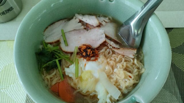 消費期限切れのインスタント袋麺を食べる。白菜、人参、卵、豚ハム、パクチー、食べるラー油を入れた。