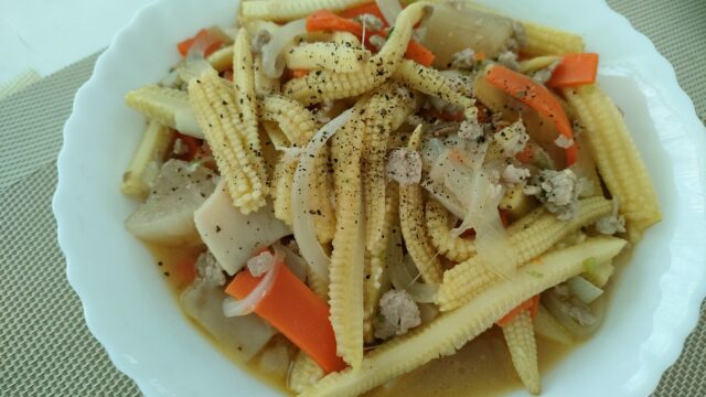 ヤングコーンとひき肉の炒め煮。所々に大根が入っているのは、炒め煮する時の水の替りにあばら肉スープの残りを使ったから。