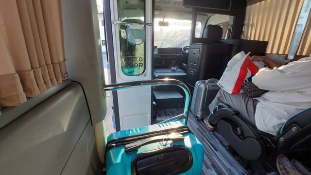 今回のバスは新しいL/Oのシートアレンジになっているらしく、今までの2席✕2席から1席✕2席✕1席と各シートが通路に出れる仕様になった模様。