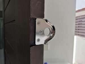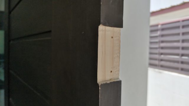 この「補助鍵」を扉と枠の隙間に取り付けるんだけれど、隙間が足りなくて差し込めないので枠or扉を削る必要があります。