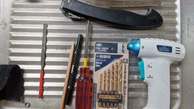 下穴無しで木ネジ入れようとしたら固くて疲れたので、ケーヨーデイツーで購入した電池式のミニドライバーとビット式のドリルで下穴加工も楽々。