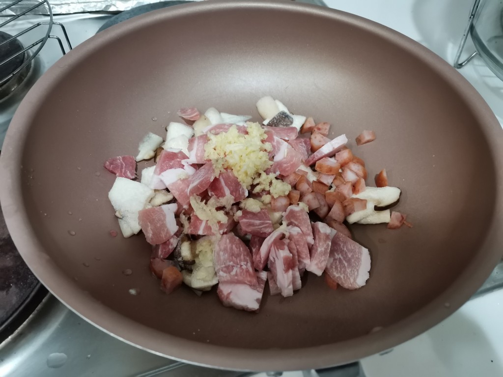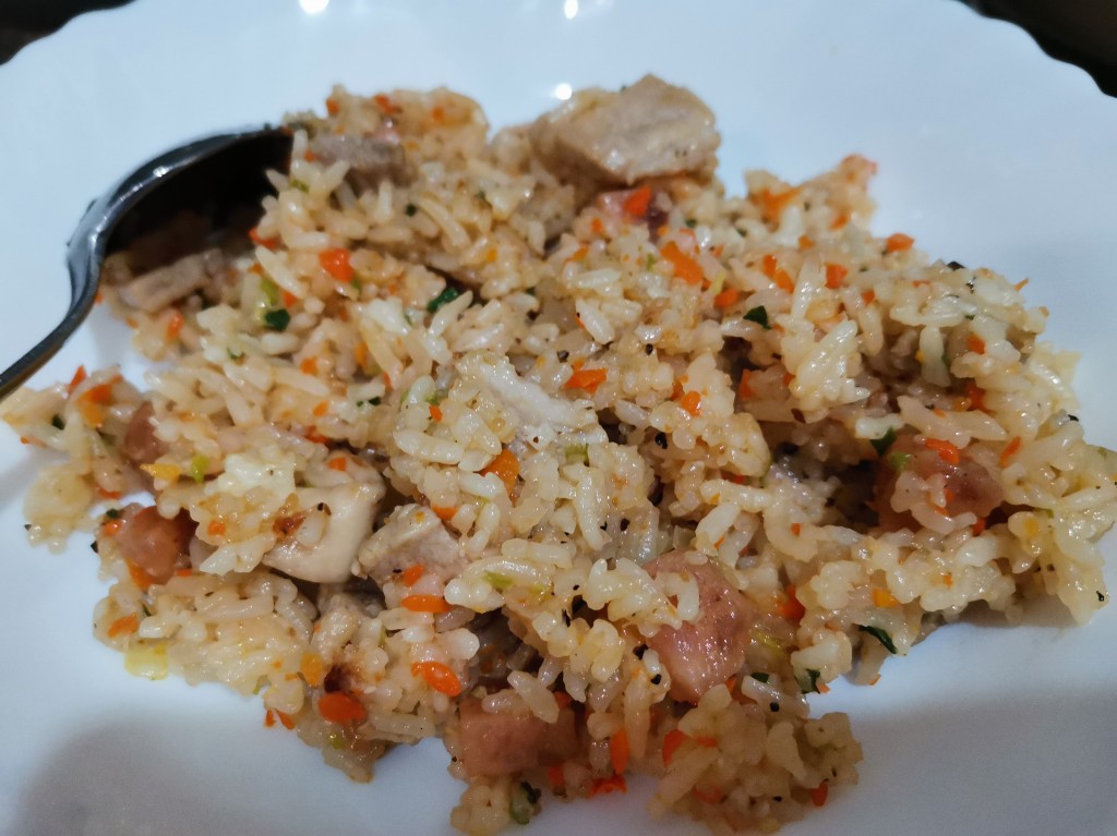 カオパット・ムー、大切な豚肉を使ったチャーハン。本来はニンニクから炒めて豚肉、野菜とかの順番で火を通すみたいだけれど、めんどくさいので全部まとめてIN。