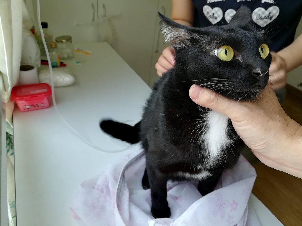 そして俺氏が黒猫ココロを捕まえて洗濯ネットに入れ、嫁氏がサクッと注射針を刺して点滴開始。