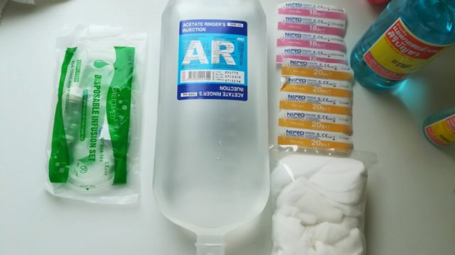 点滴セットは注射針無しで65バーツ(約230円)と安価なのでお金に余裕の少ない我が家としては助かりますね。