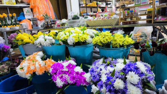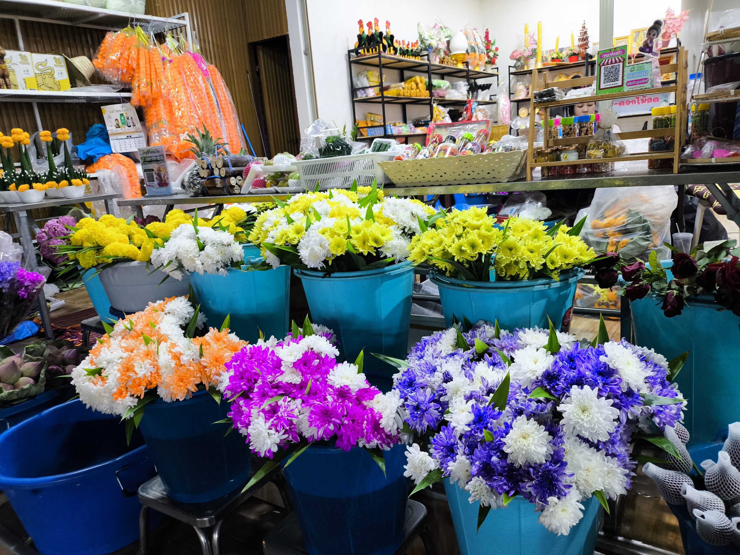 駅前市場で果物を購入後、タンブン用のお花を売っているゾーンに移動。