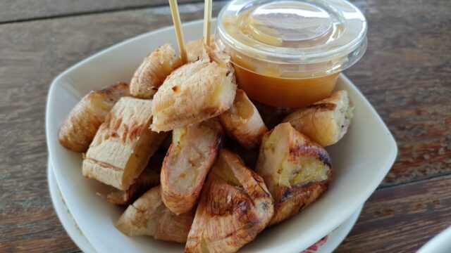 揚げバナナは美味しいですよね。あれよりは甘さ控えめ?で練乳の助けが必要です。