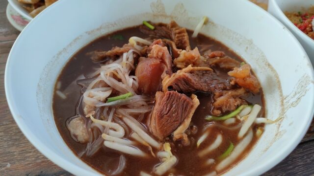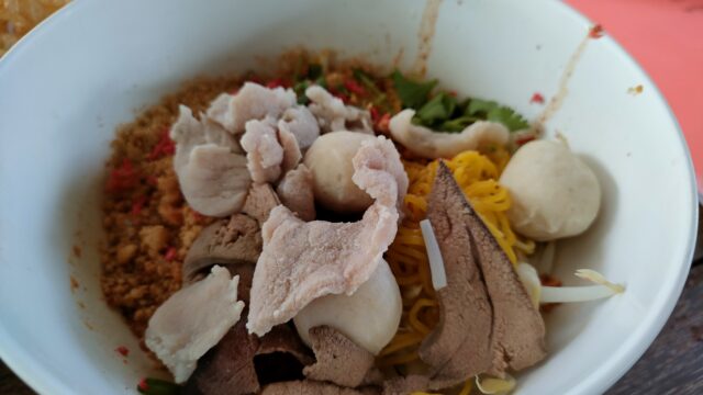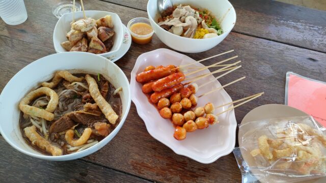他には牛肉クイッティアオ60バーツ(約240円)と汁なし麺50バーツ(約200円)にルークチンセット40バーツ(約160円)にカリカリ豚の皮10バーツ(約40円)と結構暴食しちゃった。