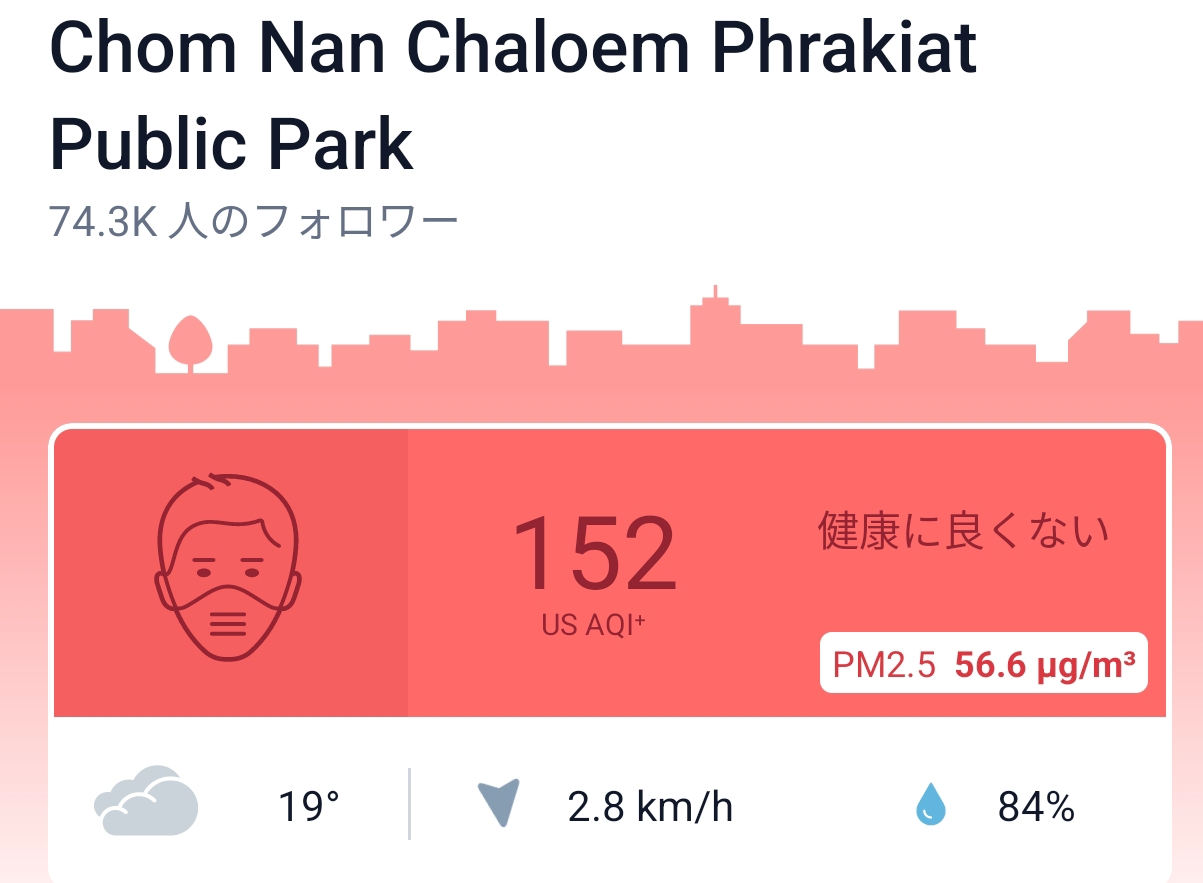 でスマホアプリで確認したらAQI152で「健康に良くない」でした。
