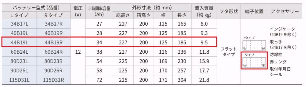 ちなみに最初の2桁(44)はバッテリー性能ランクで、次の1桁(B)はバッテリーのサイズと端子形状を表し、次の2桁はバッテリーの高さ(19)を表し、最後の1桁(L)はバッテリー端子の向きを示しています。