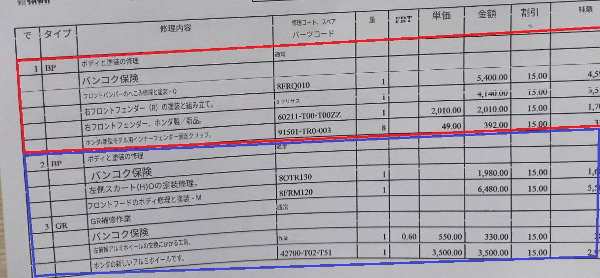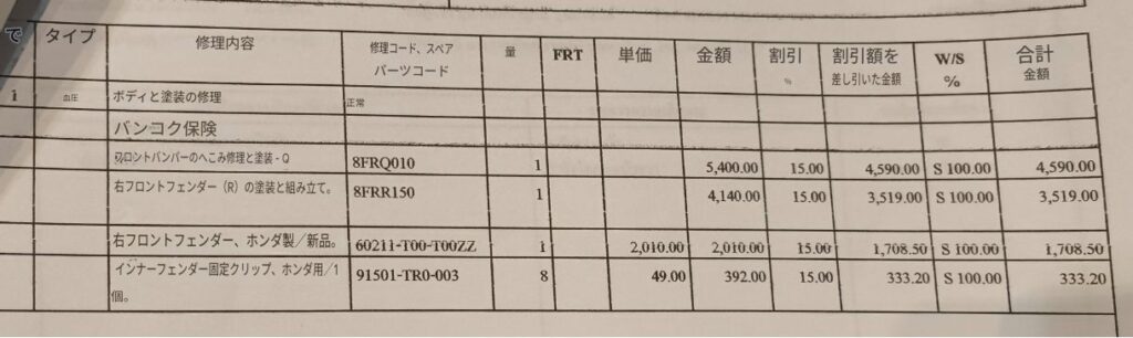 赤枠が相手側の保険で直す項目で総額約1.08万バーツ。
