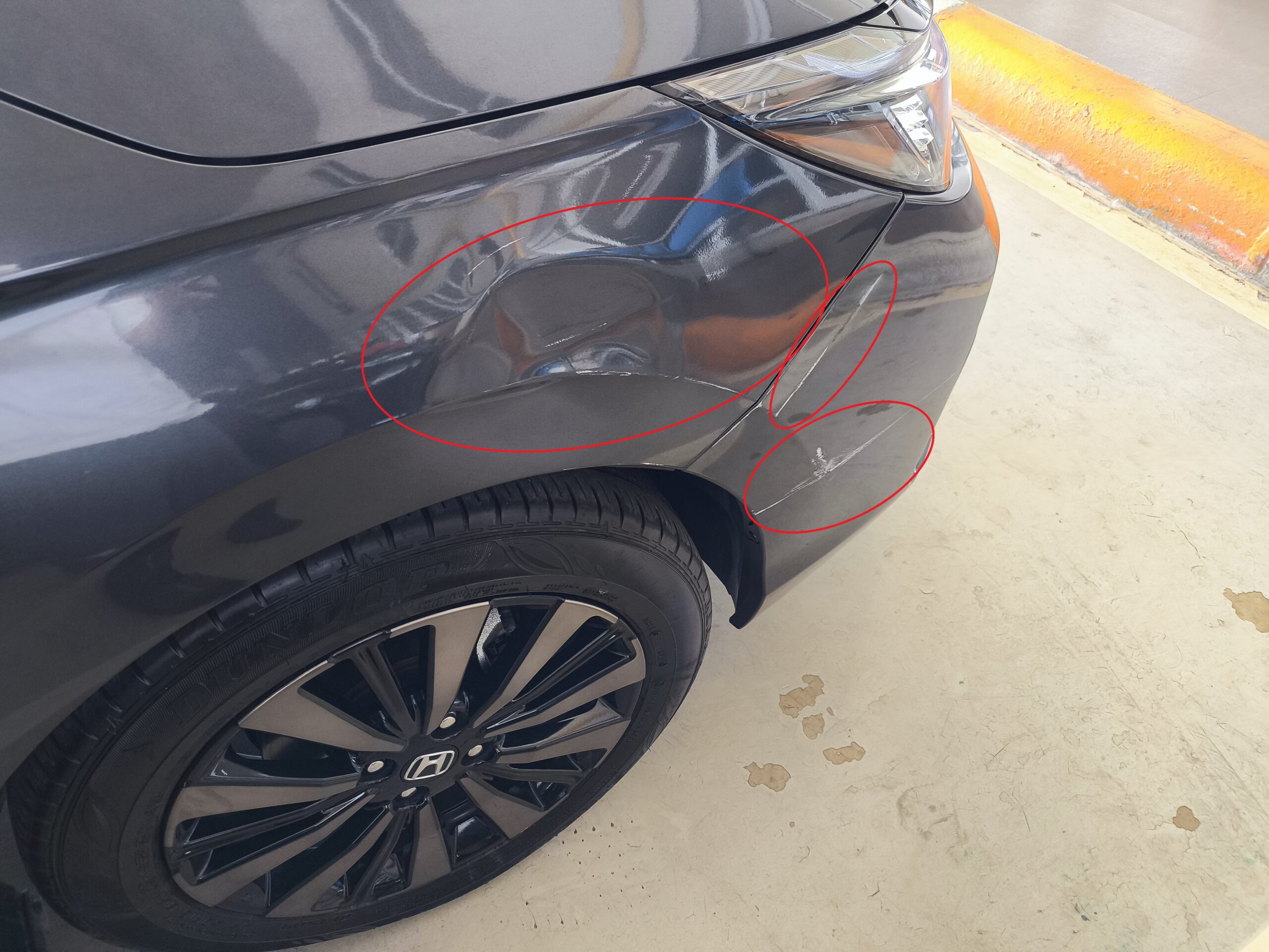 相手の保険で修理する部品はフロントバンパーの傷とフロントフェンダーの凹み部分。
