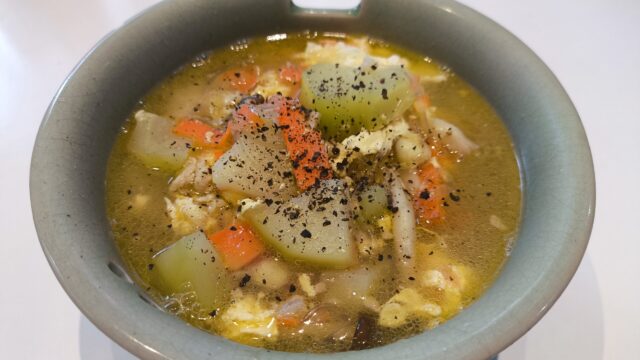 嫁氏が親戚から貰ってきたファックメオ(ハヤトウリ)でスープ作成。ハヤトウリの下処理よくわからんけど、下茹でして使ったら普通においしかった。