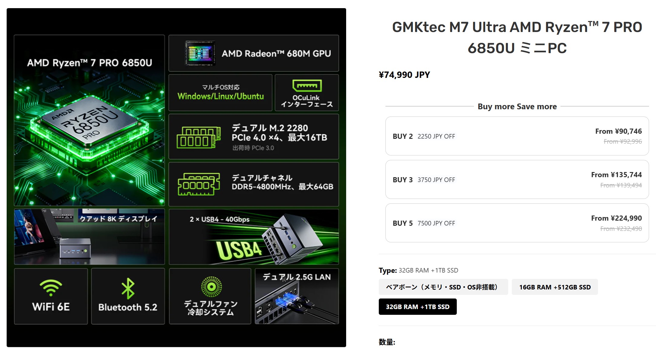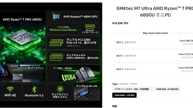 GMKtec製品も色々種類があるけど、俺氏的には少し古いCPUを積んだ「M7」がぎり手を出せる価格帯だったので、最初からメモリー32GB、記憶容量1TBのモデルを買った。