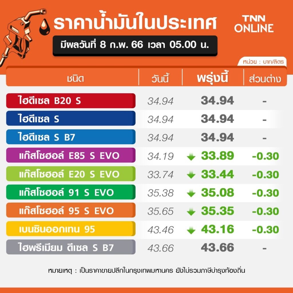 明日2月8日よりガソリン価格が0.3バーツの値下げです。一時期の急激な値上げからジリジリ下がっているけどガソホール91が34バーツ台に入ってないと高く感じる。