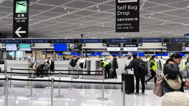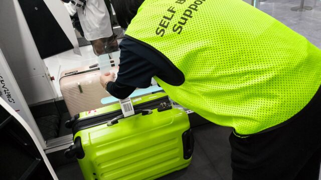 既に出発24時間前から出来るWEBチェックイン済で、スマホに電子搭乗券が有るので、セルフバックドロップで荷物を預けます。
