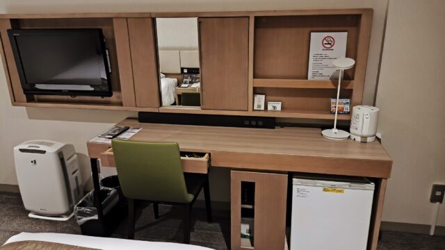 備品としてスリッパ、タイガーの高そうなポット、空気清浄機、冷蔵庫、金庫、ドライヤー、ズボンプレッサー、コーヒー等々全く不満はない。