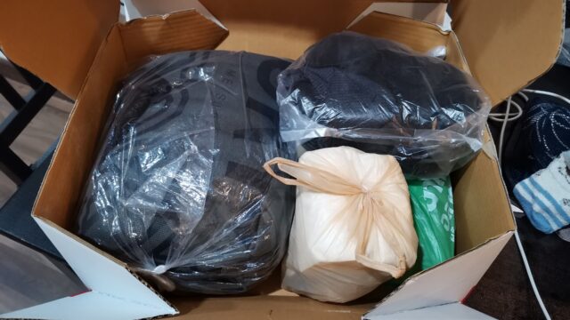 ダンボール箱を部屋で組み立て今後使わない嫁氏のスーツ類やドライヤー、俺氏のくっさい洗濯物をギュギュっと押し込みパッケージ完了。