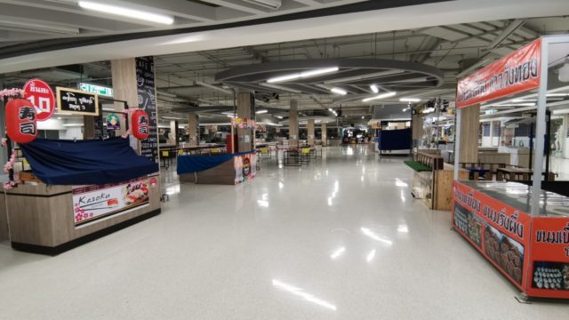 ロータスEXTRAですが、フードコートや小さなお店も閉鎖されかなり寂しい状態ですね。スーパー以外で人が多い場所は銀行くらいで、知らないおっちゃんが「なんで休業補償5000バーツ貰えないんだ」と入り口の店員さんに詰め寄っていて「それは銀行関係ないから政府に聞いて」とうんざりした様子で答えてました。