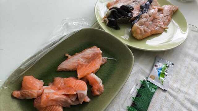 サーモンの頭部分は煮込み料理も良さそうだけど、手間を考えると塩焼きが簡単かな。