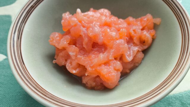 刺身としてとても美味しかったので、背骨と中骨に残った肉をスプーンで落としてサーモンの中落ち完成。