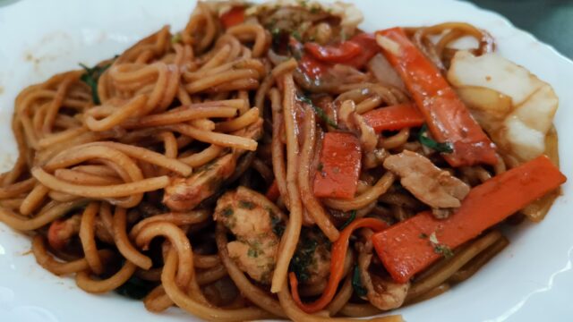 パスタを重曹入りのお湯で茹でて焼きそば風に調理。