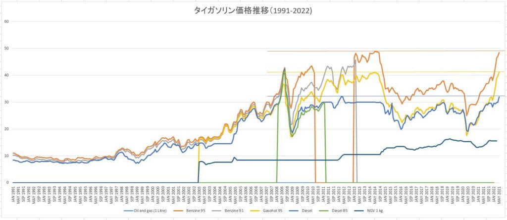 去年12月のガソリン価格と比較すれば価格はベンジン95で1.27倍、ガソホール95で1.35倍、ディーゼル(軽油)で1.13倍です。