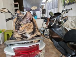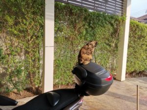 洗車中に昨晩お外に出掛けたプルさんが帰ってきて「ご飯くれ~」とウルサイです。滑って危なそうなバイクのトップボックスの上に器用に座って道路を警戒しています。
