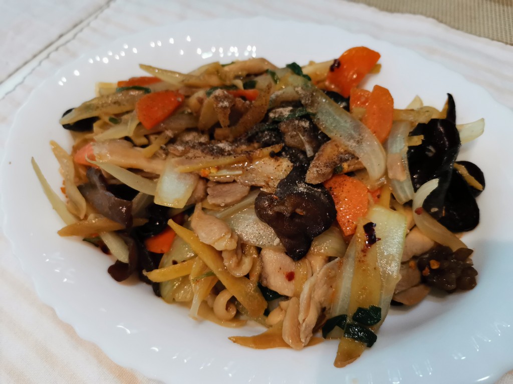 生姜をせん切りにして鶏肉、きくらげ、玉ねぎ等を炒めてオイスターソースで味付けした一品です。