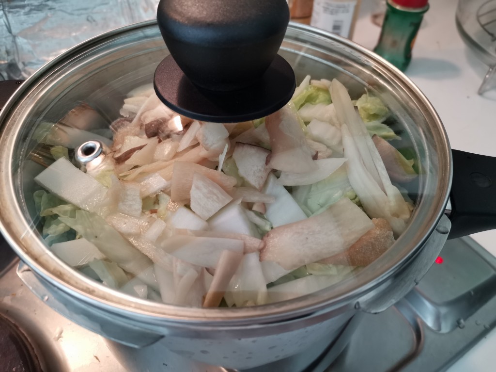 とりあえず砂肝は半分の半分に切ってよく水洗いして圧力鍋にぶっ込む。そして人参、玉ねぎ、白菜、エリンギ、ニンニク、すりおろし生姜を適当にぶっこんで15分煮込めば完成!