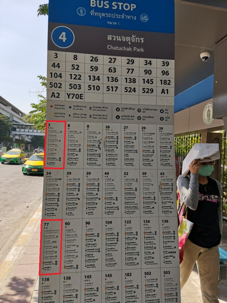 俺氏が乗ったバスは「77番」のエアコンバスで12バーツでした。エアコン無しだと8バーツくらいかな?