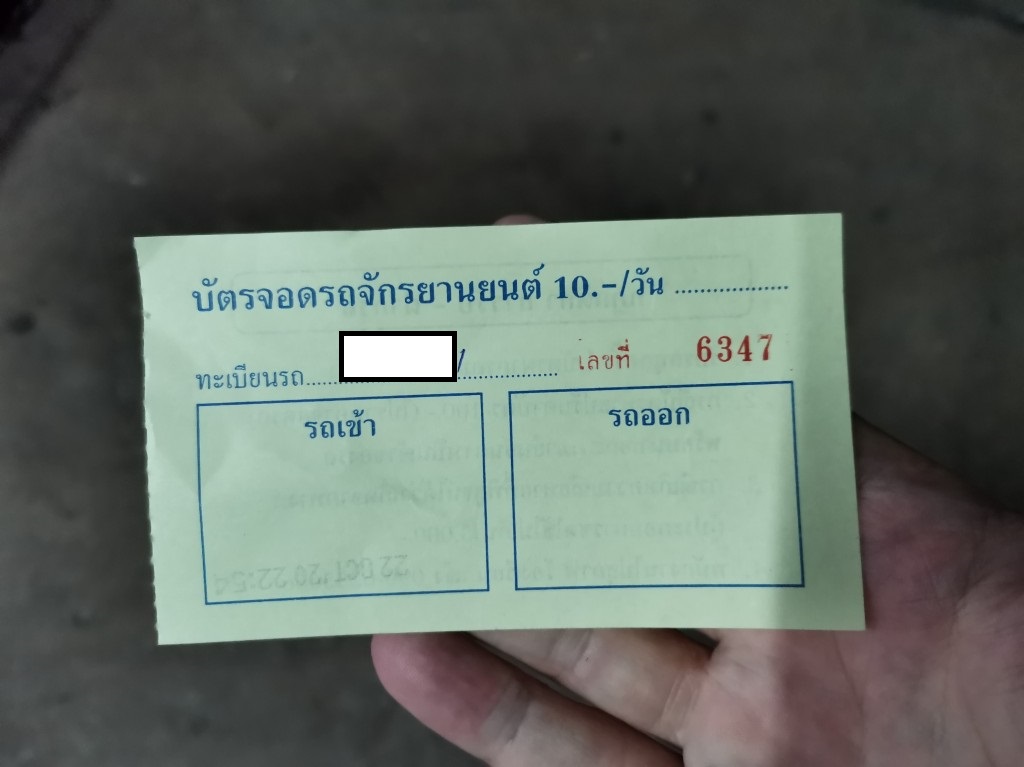 バイクのナンバーと入庫時間が印刷されたチケットを受け取り、バイクの預けはOK。荷物を担いでナコンチャイエアー乗り場に向かいます。