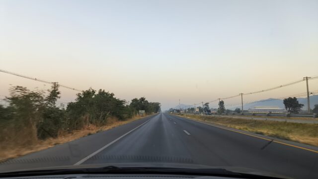 ピサヌロークは大気汚染が酷く空はモヤモヤしています。朝7時前だけどチェンマイ方面に向かう道路は車がとても多いですね。皆さん飲酒運転とかせず安全運転してね