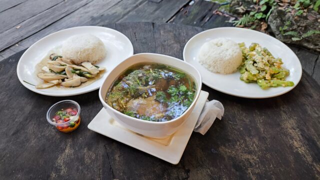 肌寒い気温だったので体の温まる「ガイトゥン・ヤージーン70バーツ(約322円)も頼み全部で170バーツ(約782円)です。