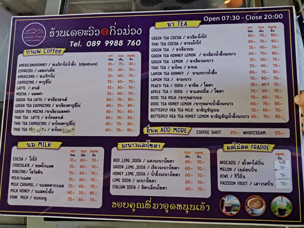 俺氏は「カフェモカ60バーツ(約276円)、嫁氏は「ココナッツジュース入り抹茶ラテ70バーツ(約322円)を頼みました。