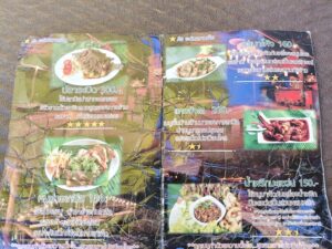 メニューは下記参照。お店のおススメは「フィッシュボム300バーツ(約1380円)。ティラピア1匹を丸ごとカリカリに揚げ、レッドカレーのつけダレで食べる辛さ★5の料理です。