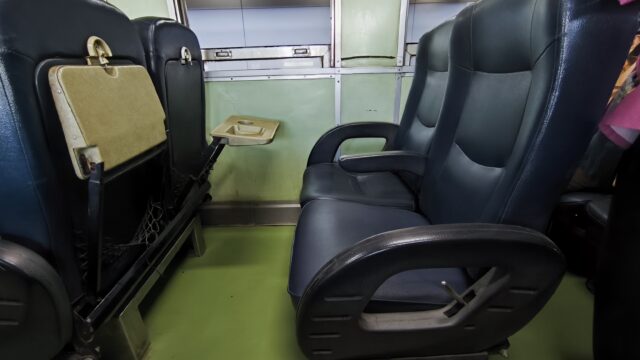 車両は良い感じのボロさ加減で、半数の机は不具合ある感じです。シートのリクライニングも動かなかったり、固定できなかったりで維持メンテは最小限って所です。