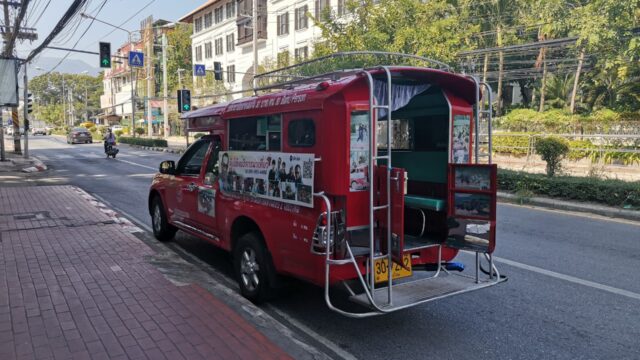 流石に徒歩はムリなので今回始めて赤いソンテウに乗った。2人で40バーツでした。