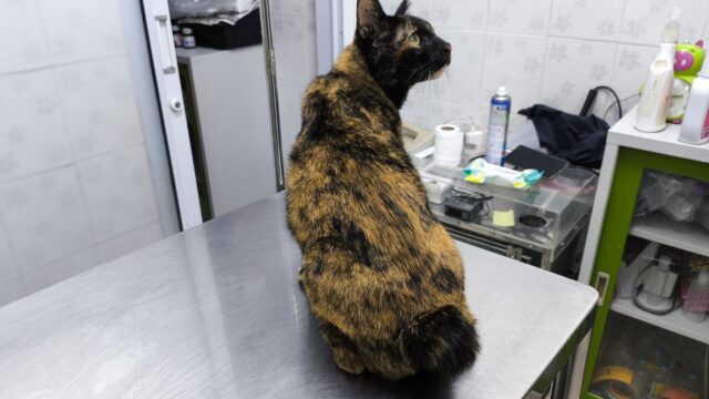 プルさんは病院で暴れるタイプではなく、診察台の上で不安そうに周りを見ながら大人しく座っています。